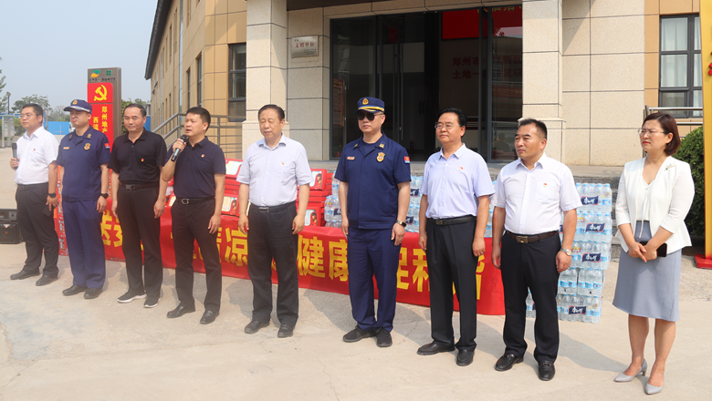 進(jìn)入夏季以來,持續(xù)出現(xiàn)的高溫天氣,給奮戰(zhàn)在建設(shè)一線的施工人員帶來嚴(yán)峻考驗(yàn),廣大職工不畏酷暑,堅(jiān)守崗位,辛勤付出。為做好廣大職工的防暑降溫工作,切實(shí)保護(hù)職工身體健康,6月11日,鄭州市總工會(huì)、鄭州市消防救援支隊(duì)到鄭州地產(chǎn)集團(tuán)西流湖公司中原新區(qū)土地一級(jí)開發(fā)項(xiàng)目指揮部開展主題為“送清涼、送安全、送健康、促和諧”的夏季送清涼活動(dòng)。鄭州市一級(jí)巡視員、市總工會(huì)黨組書記、主席趙新中,市消防救援支隊(duì)副支隊(duì)長(zhǎng)、滅火救援指揮部部長(zhǎng)李隆,市總工會(huì)副主席宋少丹,鄭州地產(chǎn)集團(tuán)有限公司監(jiān)事會(huì)主席、工會(huì)主席李靜波及西流湖公司黨支部書記、董事長(zhǎng)、總經(jīng)理吉獻(xiàn)亮等領(lǐng)導(dǎo)出席活動(dòng)?;顒?dòng)由西流湖公司副總經(jīng)理昌磊主持。
